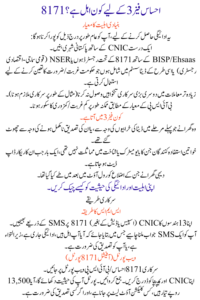 8171 Ehsaas Program Phase 3Early October 2025During September 2025 (in phases; districts roll‐out in different weeks)Rs. 13,500 per eligible familyCheck via SMS (CNIC → 8171), Official web portal, Visit BISP / Ehsaas / payment centers / authorized outlets with original CNIC & biometric verification