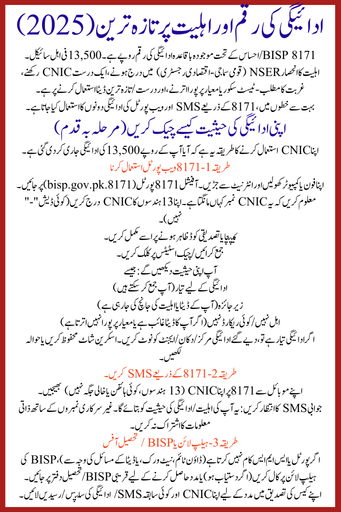 | Not Eligible / No Record | Your CNIC is not in active beneficiary list. Either data not registered, survey not done, or your household doesn’t meet criteria. You may need to update NSER or re-register. |