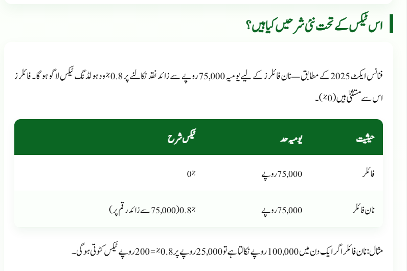 According to the Finance Act 2025, non-filers will now pay a 0.8% withholding tax on daily cash withdrawals exceeding Rs. 75,000.