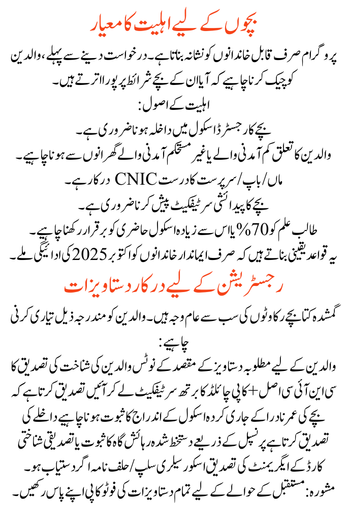 | Benazir Taleemi Wazaif October 2025 | September 25, 2025 | October 30, 2025 | Rs. 1,500 – Rs. 5,000 (per child, per month depending on class & gender) | Offline at nearest BISP office (form + school verification) |