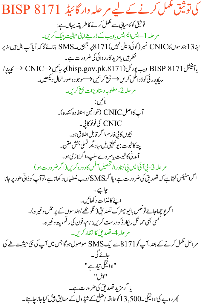 | Method of Verification | Official methods: CNIC via SMS (8171), Web Portal (8171.bisp.gov.pk), In-person at BISP/NADRA/Tehsil Office |