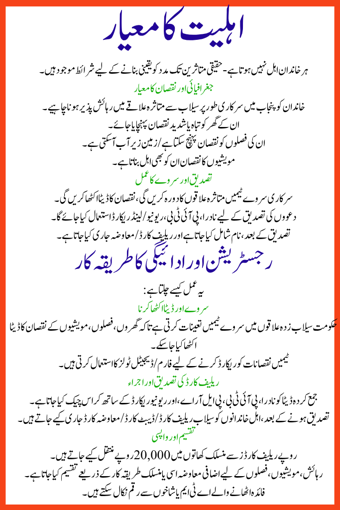 - New ATM / debit-type cards (“flood relief cards”) are being issued after verification through PITB, NADRA, and other authorities.