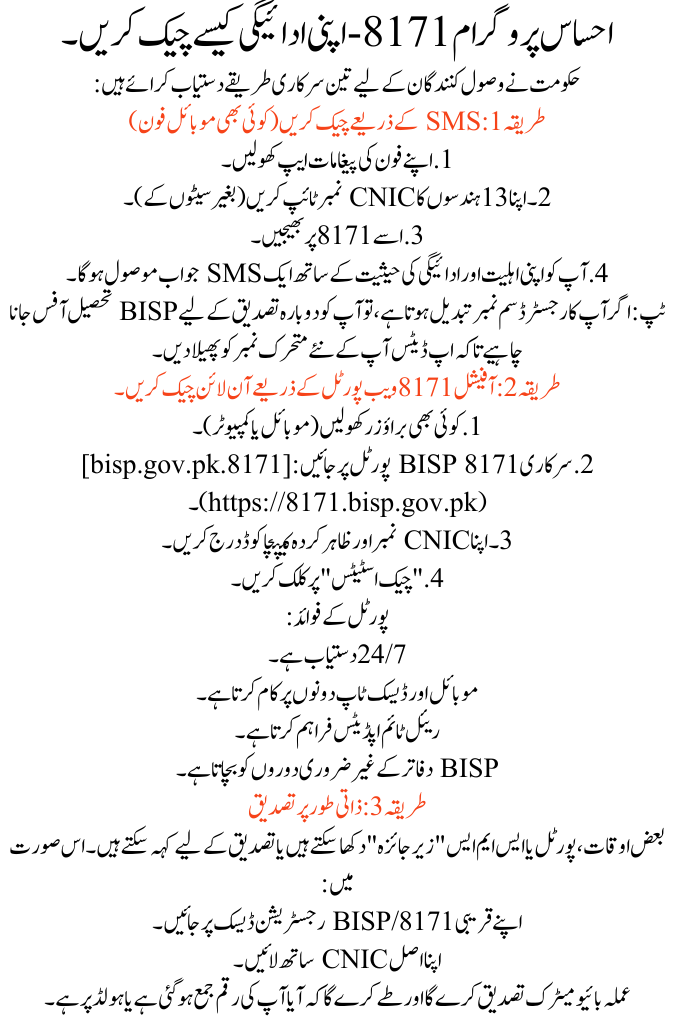 By SMS to 8171, online portal 8171.bisp.gov.pk, or visiting a BISP office.