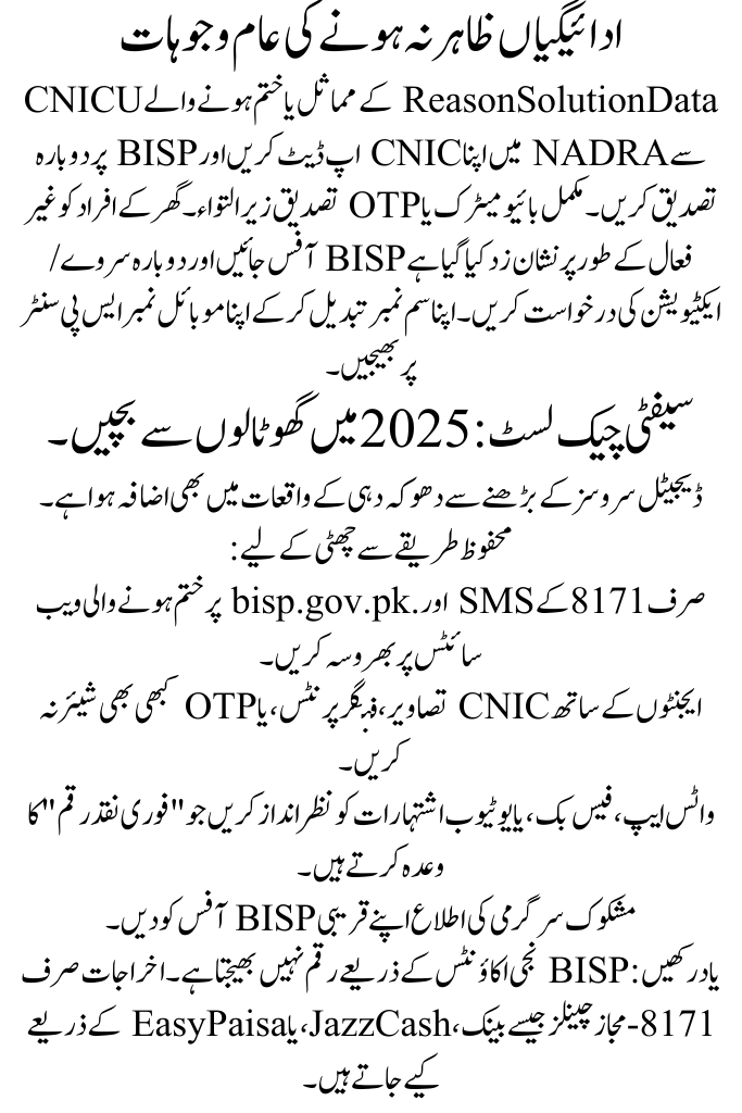• Use only official channels (8171 SMS, BISP portal, or Tehsil offices).