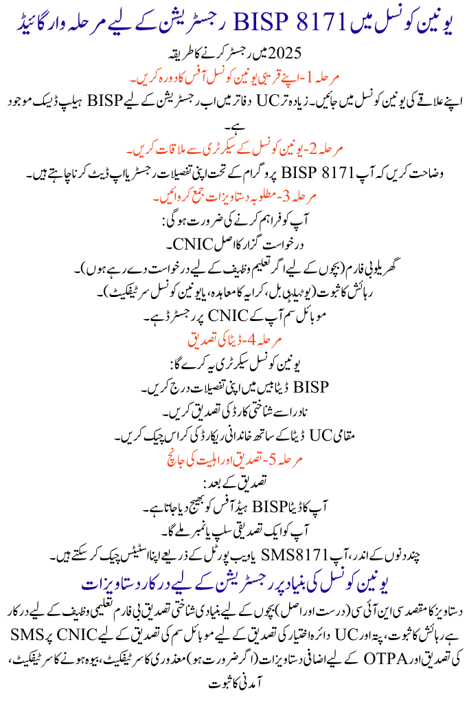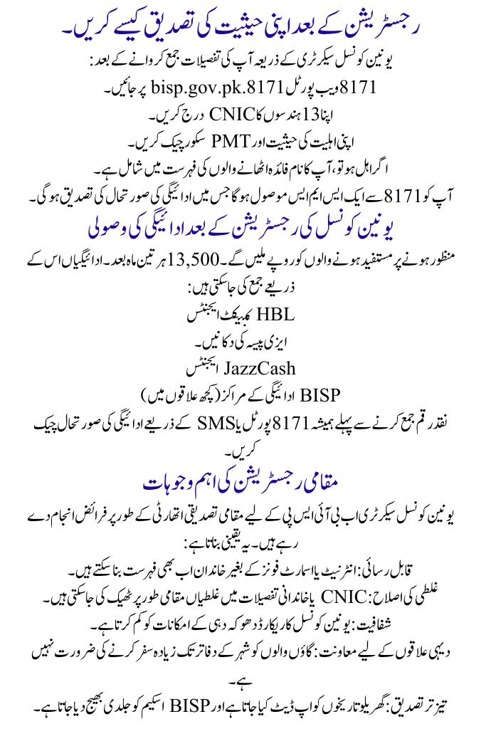 | BISP 8171 Registration 2025 | January 2025 | Ongoing | Rs. 13,500 quarterly installment | Online (8171 Portal / SMS) + Union Council Secretary |